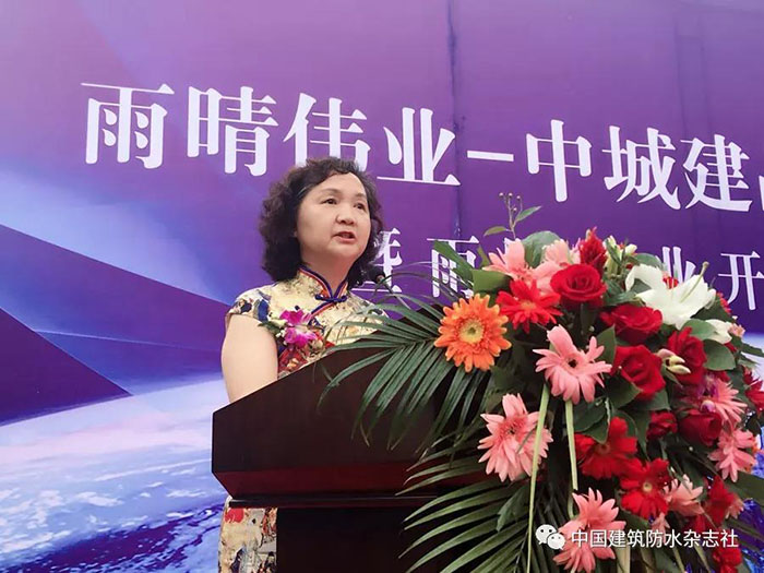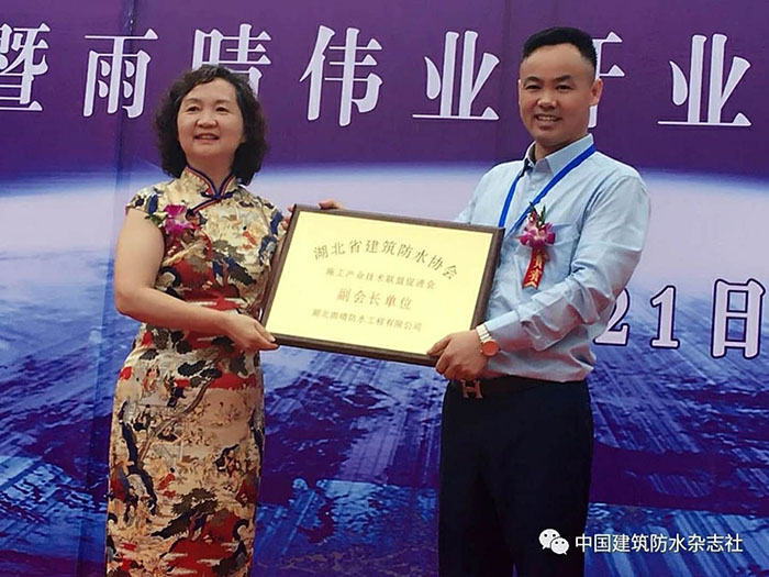 隨后,湖北防水協(xié)會會長桂春芳女士代表湖北防水協(xié)會在開業(yè)慶典大會上發(fā)表重要講話,她對湖北雨晴由最開始的施工企業(yè)轉(zhuǎn)型為防水系統(tǒng)服務商的工程進行了簡要介紹,并對之前雨晴承接的眾多國家大型、重點項目的防水工程予以肯定,并對雨晴在湖北乃至華中地區(qū)較高知名度,美譽度,影響力予以了肯定。她還說:當前,高質(zhì)量發(fā)展是新時代的要求,也是防水行業(yè)新時代的使命,并希望雨晴集團在產(chǎn)品質(zhì)量、工程質(zhì)量和服務質(zhì)量的管理上進一步做深做透做細,日益精進。心無旁騖造產(chǎn)品、一絲不茍干工程、全心全意做服務,使雨晴集團快速進入高質(zhì)量高效益發(fā)展的康莊大道。之后授予雨晴公司“湖北省建筑防水協(xié)會施工產(chǎn)業(yè)技術(shù)聯(lián)盟促進會副會長單位”。